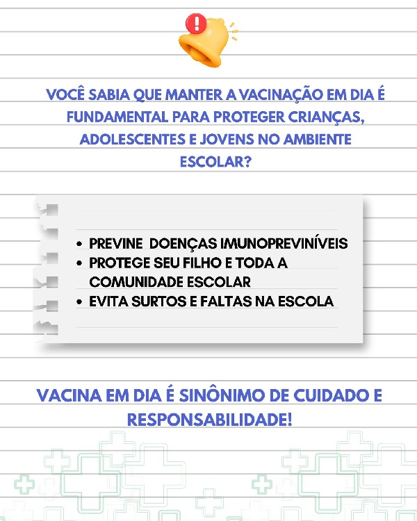Manter a vacinação em dia é um cuidado essencial para proteger crianças, adolescentes e jovens no ambiente escolar. As vacinas previnem doenças, evitam surtos e garantem mais segurança para toda a comunidade escolar.